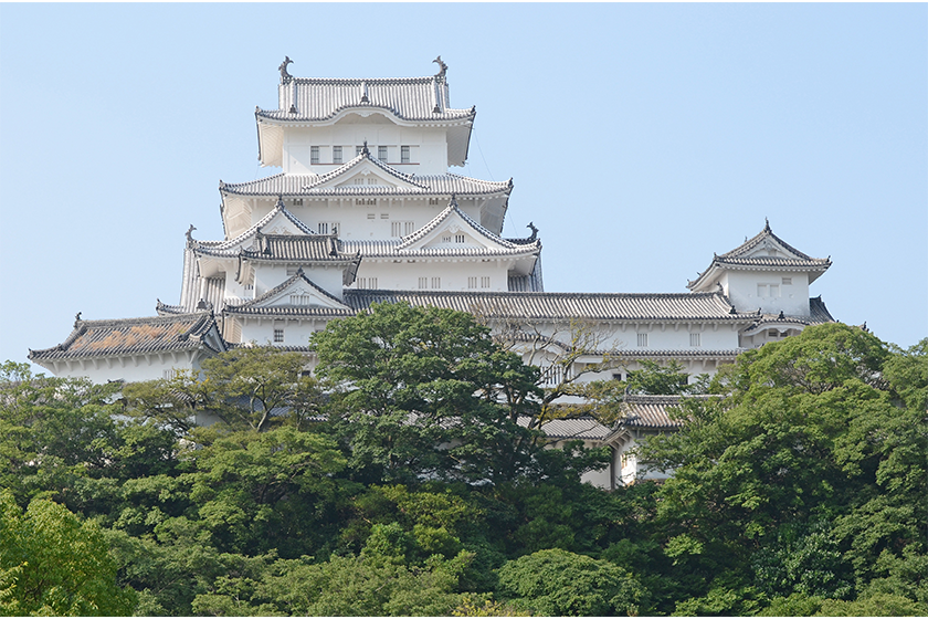 姫路城は、戦国時代から江戸時代にかけて改修を重ねてきた名城です。平成にも大改装が行われ、白く塗り直された白漆喰で仕上げられた外壁は美観だけでなく、防火性も兼ね備えた合理的な設計。一方で配置や屋根の重ね方では複雑な外観形態を構成しており、独特の工夫をしたもので壮観なお城です。