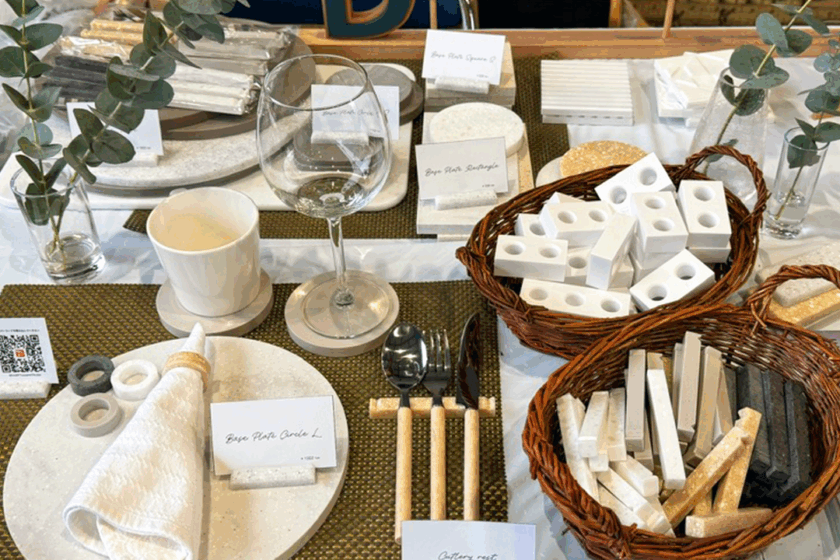 最近注目が高まっている 人工大理石アイテムやアップサイクル雑貨 も展示。
