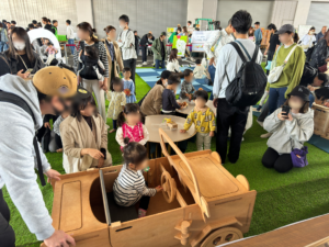 子どもたちに乗って遊んでもらえる、釘などを使わない実車可能な木製の車の試乗会、インテリアグッズの格安販売、展示などを行います!